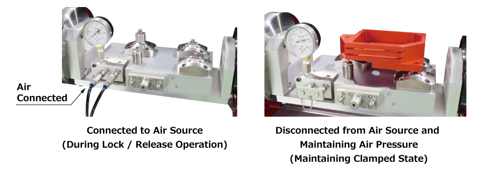 The coupler can be disconnected under pressure and its air non-leak function allows for holding the pressure on the fixture side. The air pressure in actuators on the fixture can be maintained even after the coupler is disconnected from the air source.