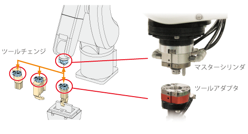 高精度なロボットハンドチェンジャーで ロボットの多機能化(汎用化)。 ツール交換時間の短縮が可能となり、 生産性UPにつながります。