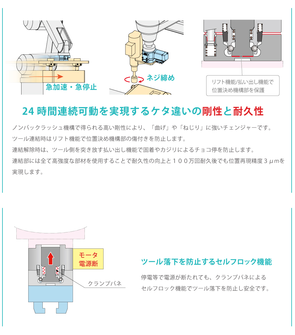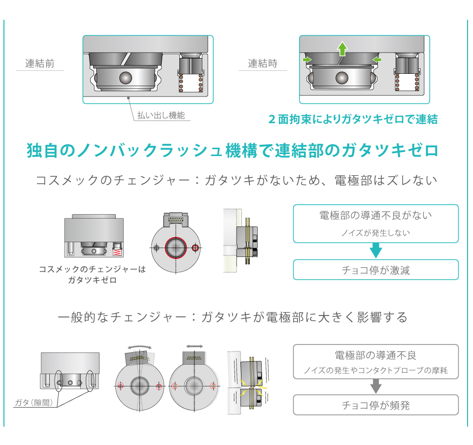 連結時のガタツキゼロで高精度(位置再現精度:3μm)
