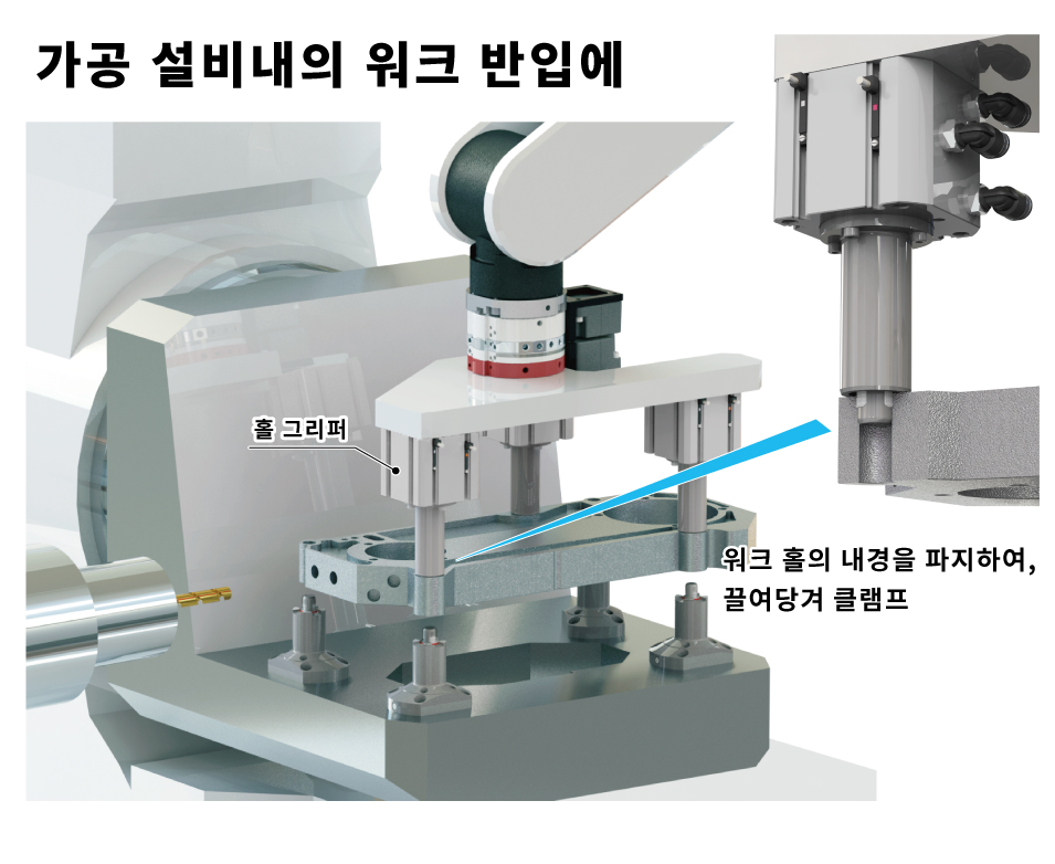 워크 홀의 내경을 파지하고, 끌어들여 클램프합니다.